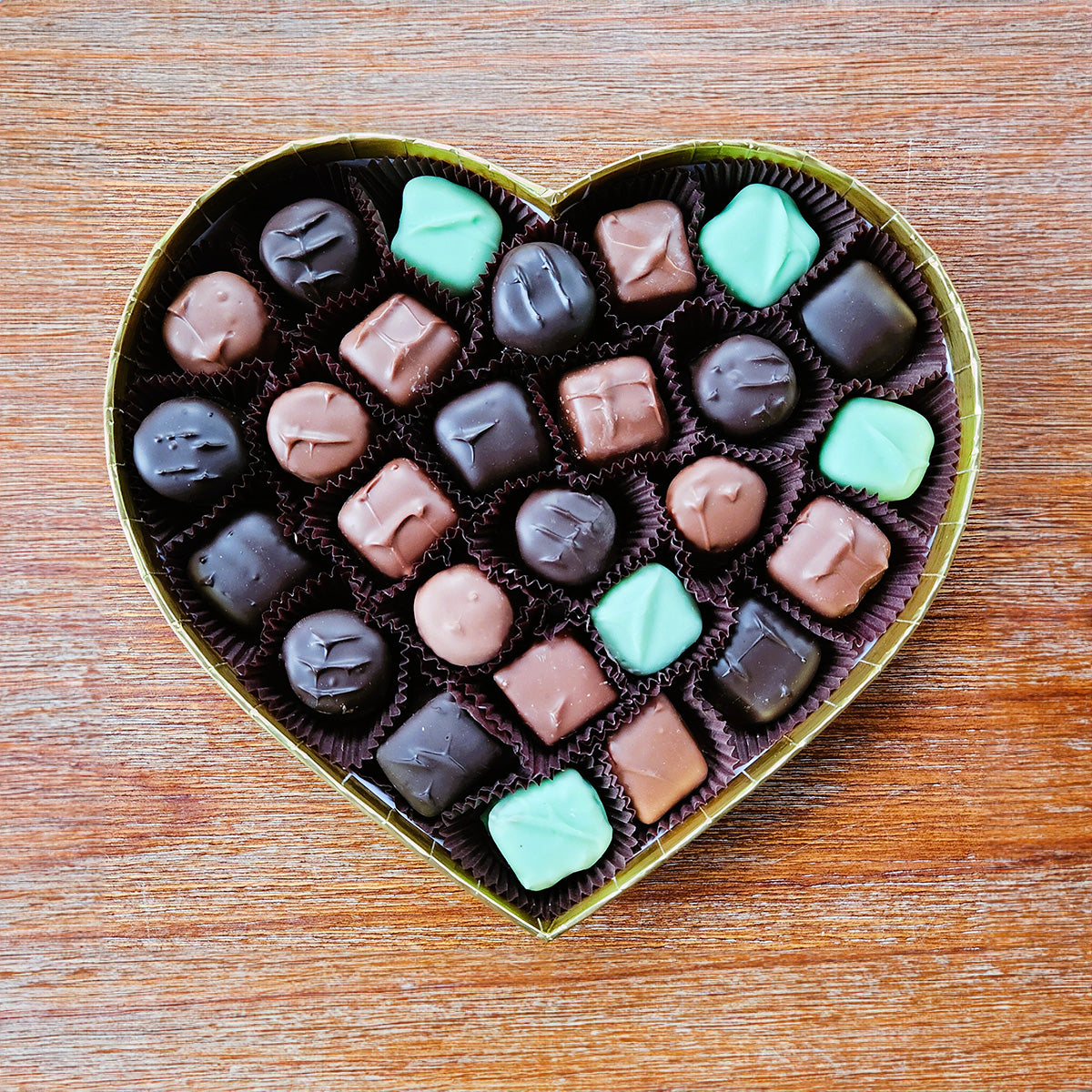 Packed fresh to order. This heart includes an assortment of our finest chocolates including Milk and Dark Chocolate Creams and Jellies, French Mints, Cherry Cordials, Truffles, and Caramels.